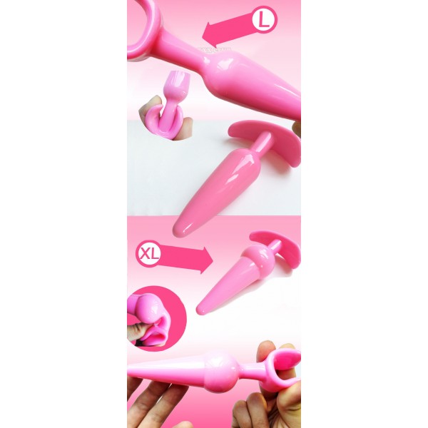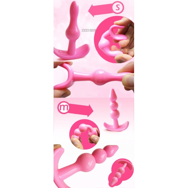 All the benefits of anal beads, this four plug kit has four silicone plugs that start small and get larger, allowing you to get accustomed to the insertion. Experience a brand new sensation as each silicone plug pushes into your ass. The T bar base allows you to impale yourself with all of the lenght of each plug!
