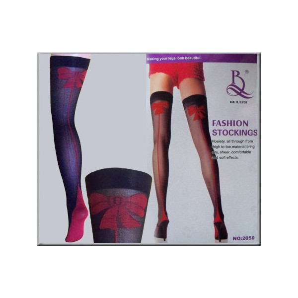 Black thigh high stockings with lace top and red bow detail.