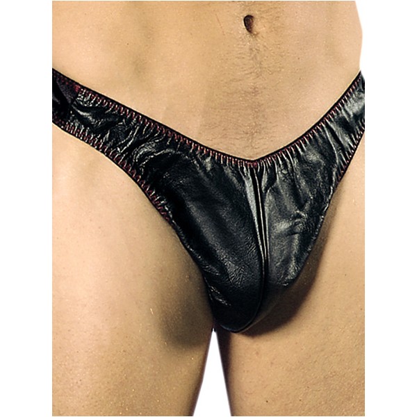 Sexy men's faux leather thong with stretch spandex rear panel and small red stitch detail on the front.