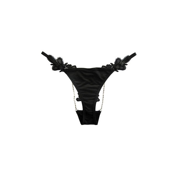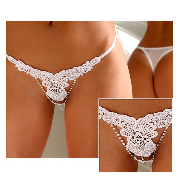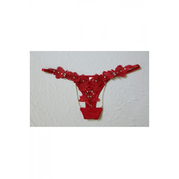 Sexy thong with lace and rhinestone front panel in clours white, red or black. The side straps are adjustable.